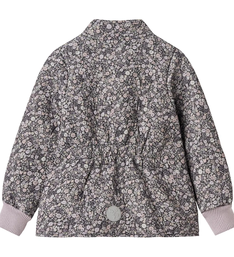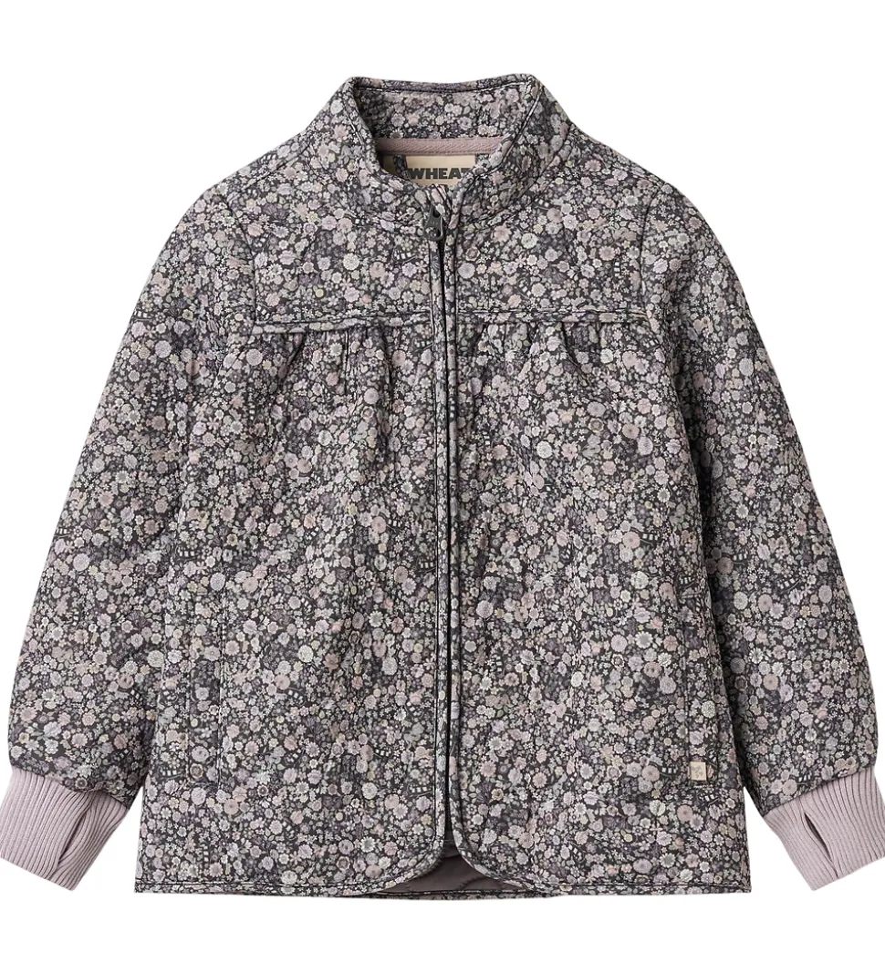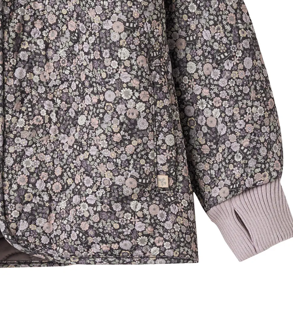Smuk Wheat termojakke i mørk koksgrå med et alloverblomsterprint i støvede lilla, rosa og grønne nuancer samt ribkanter i støvet lilla. Termojakken har en bølgende, quiltet struktur.