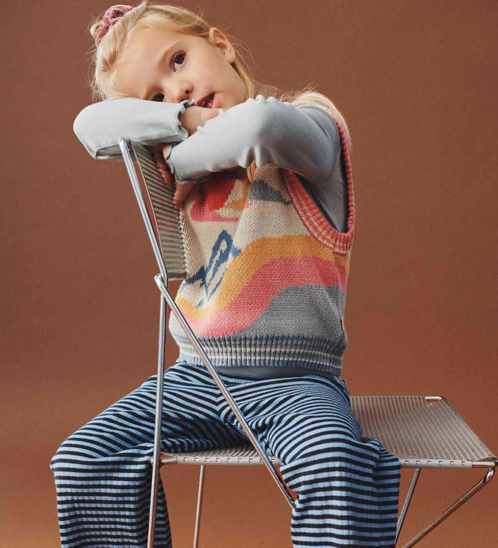 Charmerende Wheat vest i beige med landskabsprint i gule, rosa og blå nuancer. Vesten har strikket struktur med en rund halsudskæring og ribkanter i alle åbninger.