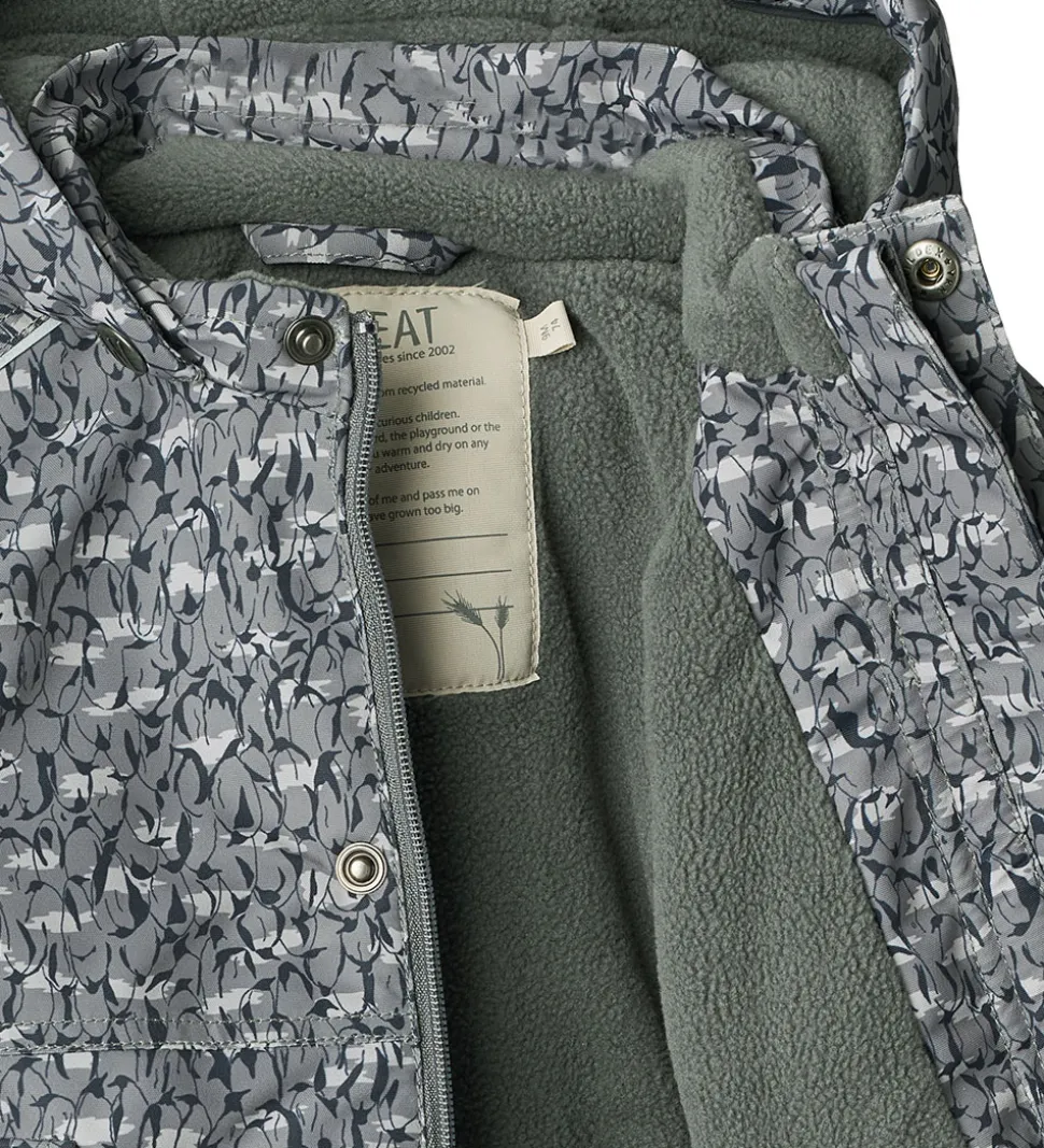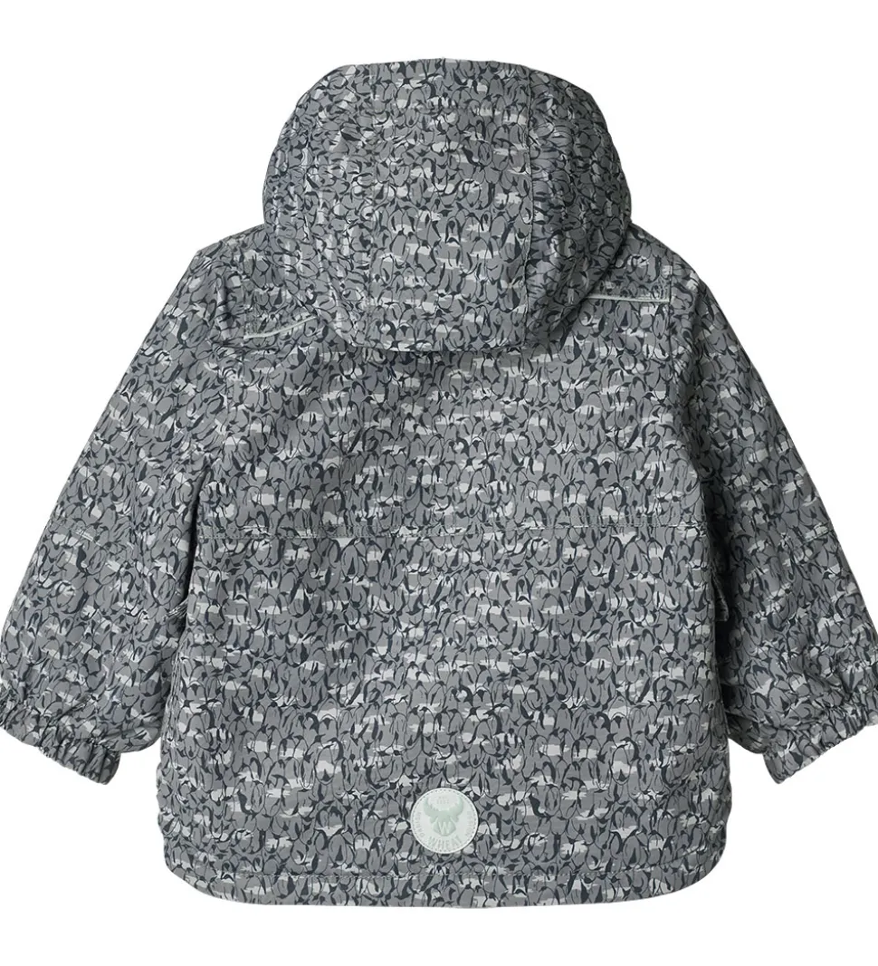 Smart Wheat vinterjakke med et gråt og sort alloverprint af tætstående pingviner.