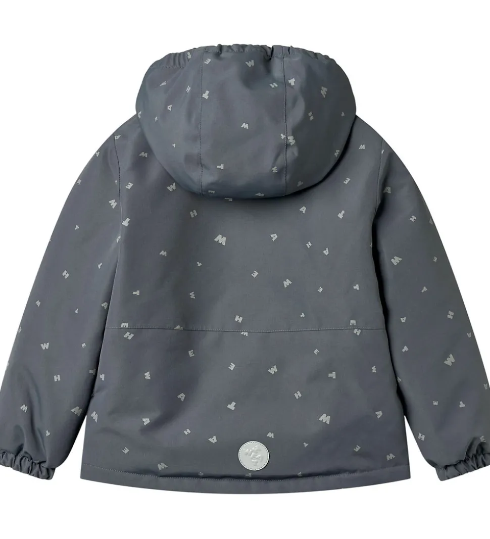 Fin Wheat vinterjakke i gråblå med alloverprint af bogstaver fra brandets navn og refleksprint og -detaljer.