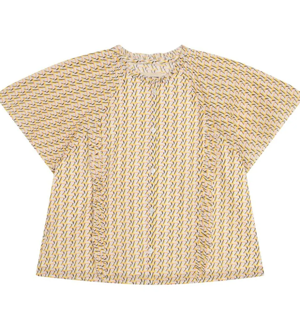 Zadig & Voltaire toppen har korte ærmer med en god vidde. I halsåbningen har den en fin flæsekant, og ned ad siderne på fronten har den også fine flæser. Toppen åbnes hele vejen ned fortil med små, hvide knapper, og den er lavet i en let, fastvævet kvalitet.