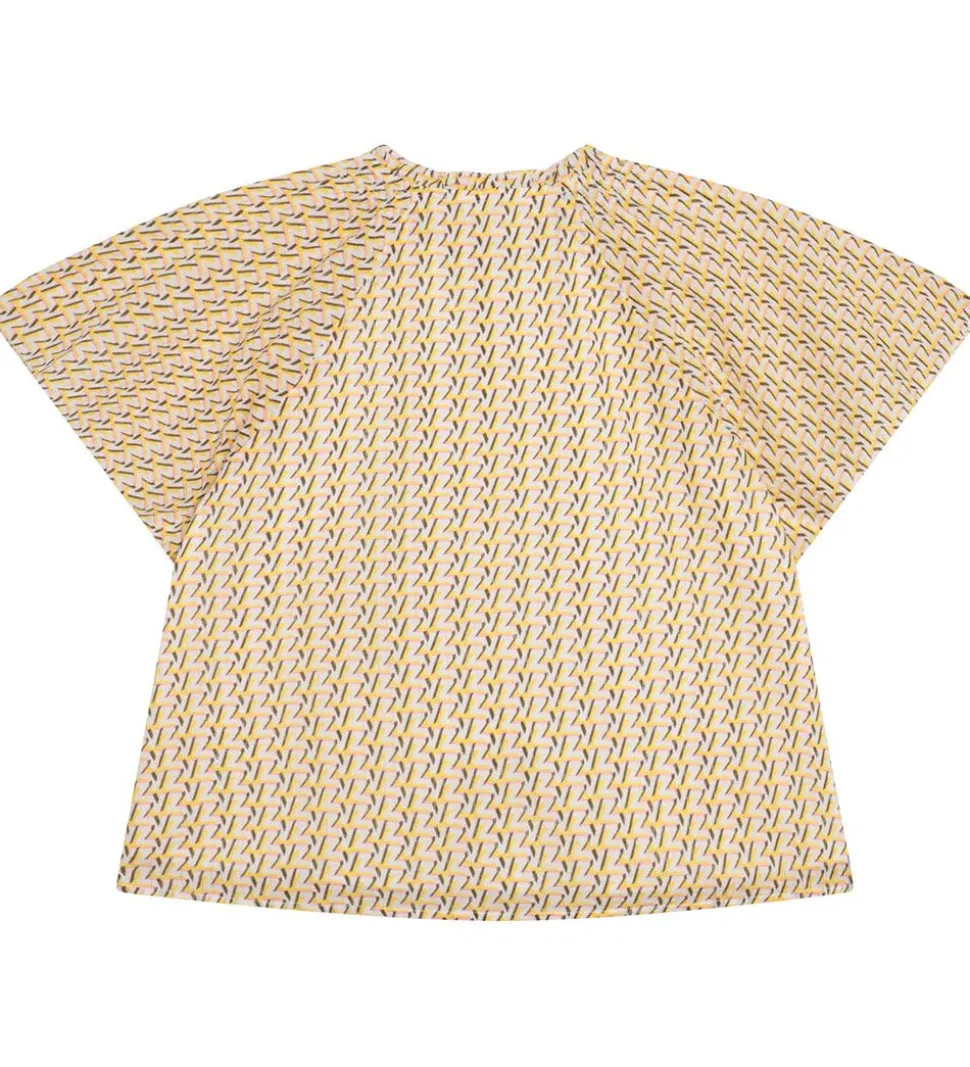 Flot Zadig & Voltaire top i hvid med et alloverprint, der ligner stjerner i gul med detaljer i sort og rosa, og toppen har smalle, lodrette striber i guld.