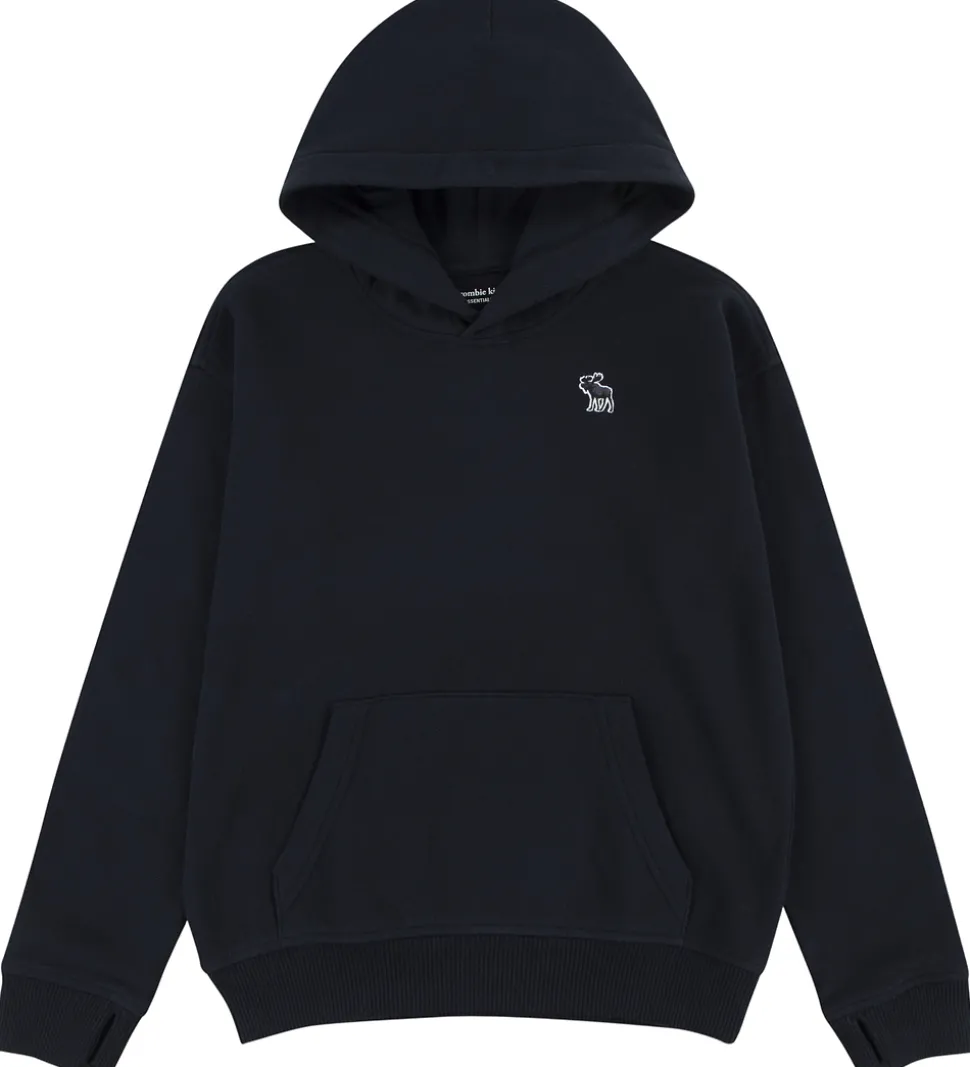 Lækker hættetrøje fra Abercrombie & Fitch i ensfarvet sort sweat. Hættetrøjen har en fast hætte med et bomuldsfor, og den har brede ribkanter. Ved ærmerne er der et lille hul til tommelfingeren. Fortil sidder der en stor kængurulomme, og hættetrøjen har blødt, børstet bomuld på indersiden.