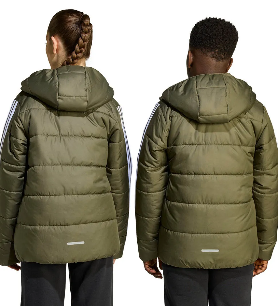 Lækker adidas Performance dynejakke i grøn med vandrette syninger og et refleks logoprint på venstre bryst. Ned ad ærmerne er de karakteriske striber i hvid.