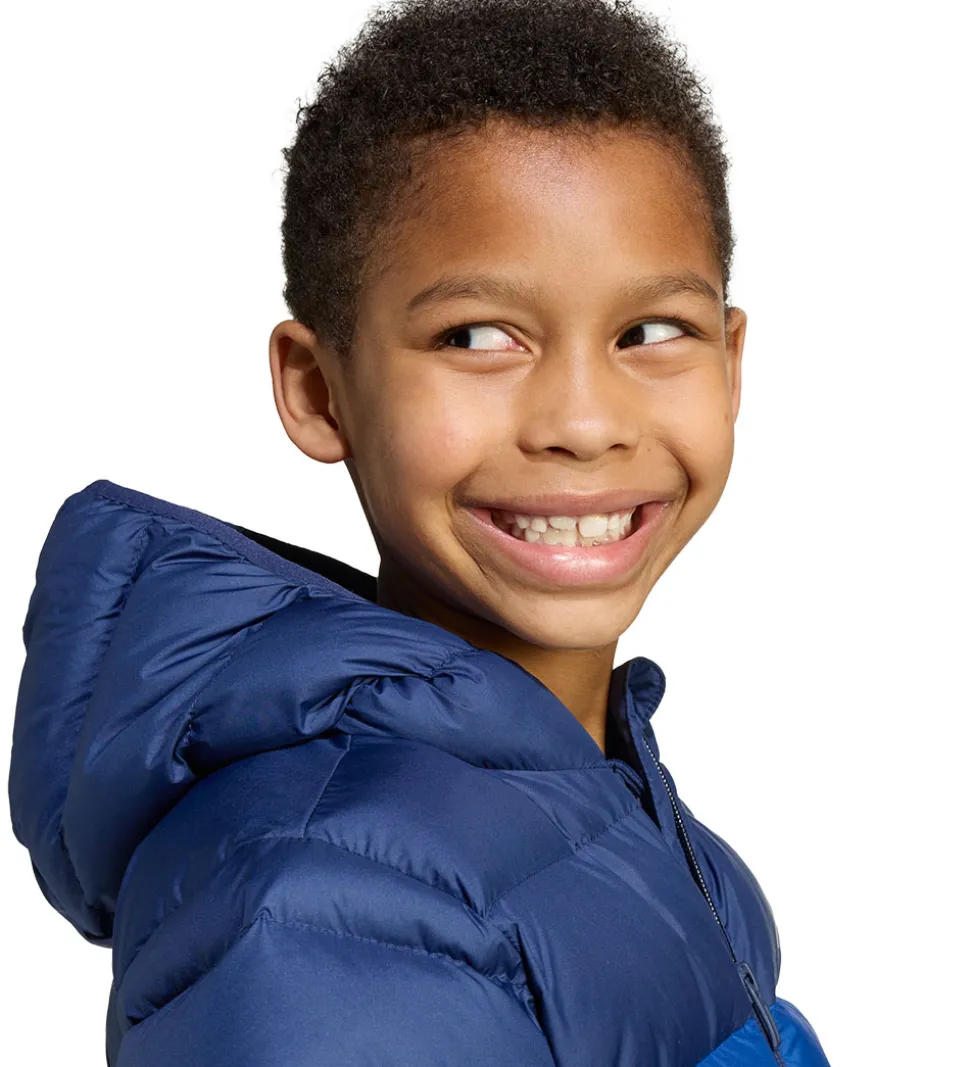 Flot adidas Performance dynejakke i mørkeblå med to horisontale striber i lysere blå nuancer. Et logo pryder brystet og giver dynejakken et stilrent udtryk.