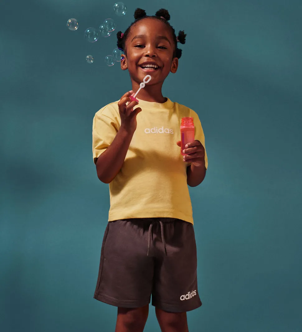 Smart adidas Performance sæt, der består af en t-shirt og et par sweatshorts. T-shirten er støvet gul med et stort, gvidt logo på fronten, og sweatshortsene er grå med et hvidt logo nederst på venstre bukseben.