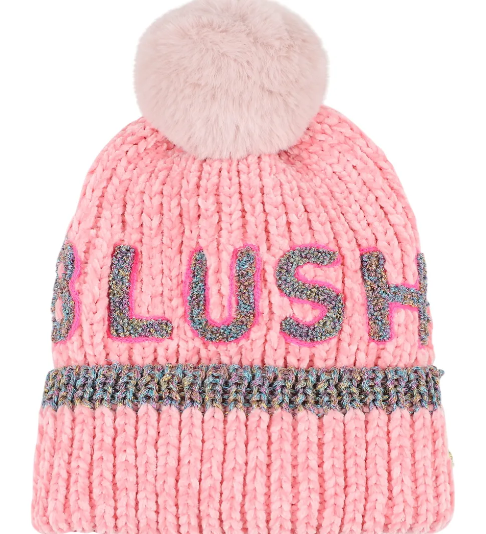 Charmerende Billieblush hue i en klar pink nuance. Huen har en blød pompom på toppen og et iøjnefaldende logo hele vejen rundt, med glitrende bogstaver. En bred strik med en fin, skinnende effekt giver ekstra detaljer til huens nederste kant. Billieblush kombinerer stil og funktion i dette unikke design.