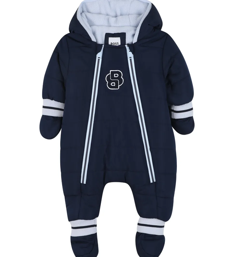 Smart BOSS flyverdragt i mørkeblå med lyseblå kanter med en smal, navy stribe, og fortil sidder der et mærke af navy frotté som former to B’er.