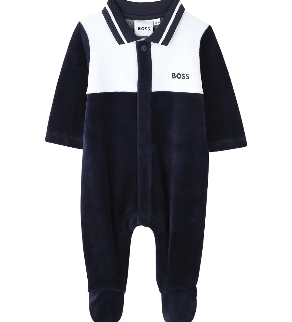 Elegant BOSS natdragt i navy velour, og øverst på fronten er den hvid. Natdragten har lange ærmer, og benene har faste fødder. I halsåbningen har natdragten en klassisk krave med ribstruktur. Natdragten åbnes ned ad fronten og ned ad begge bukseben med skjulte trykknapper.
