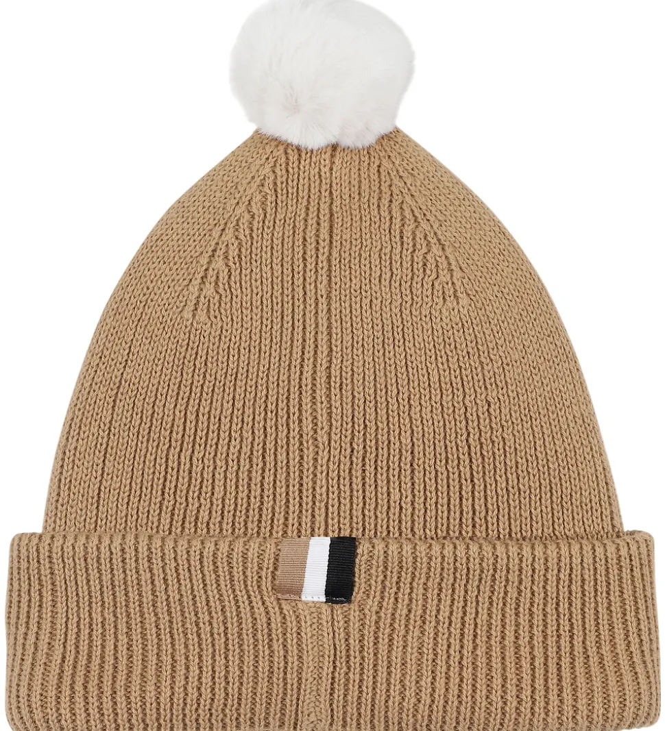 Lækker BOSS hue i lysebrun i en strikket kvalitet og med ribstruktur. Huen har en hvid pompon på toppen, der tilføjer et stilfuldt præg. Fronten prydes af et hvidt BOSS logobrodering. Huen har en spids form, og den består af to lag med et ombuk langs kanten.