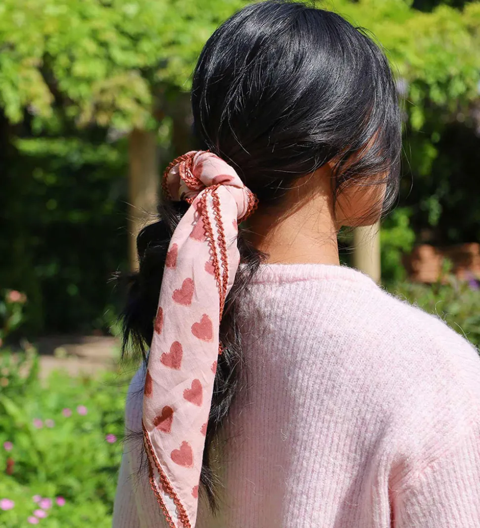 Fint By Stær tørklæde i rosa med print af røde hjerter og en mørkerød syningsdetalje langs kanten. Tørklædet fra By Stær har en kvadratisk form og tilføjer et smart udtryk til outfittet.