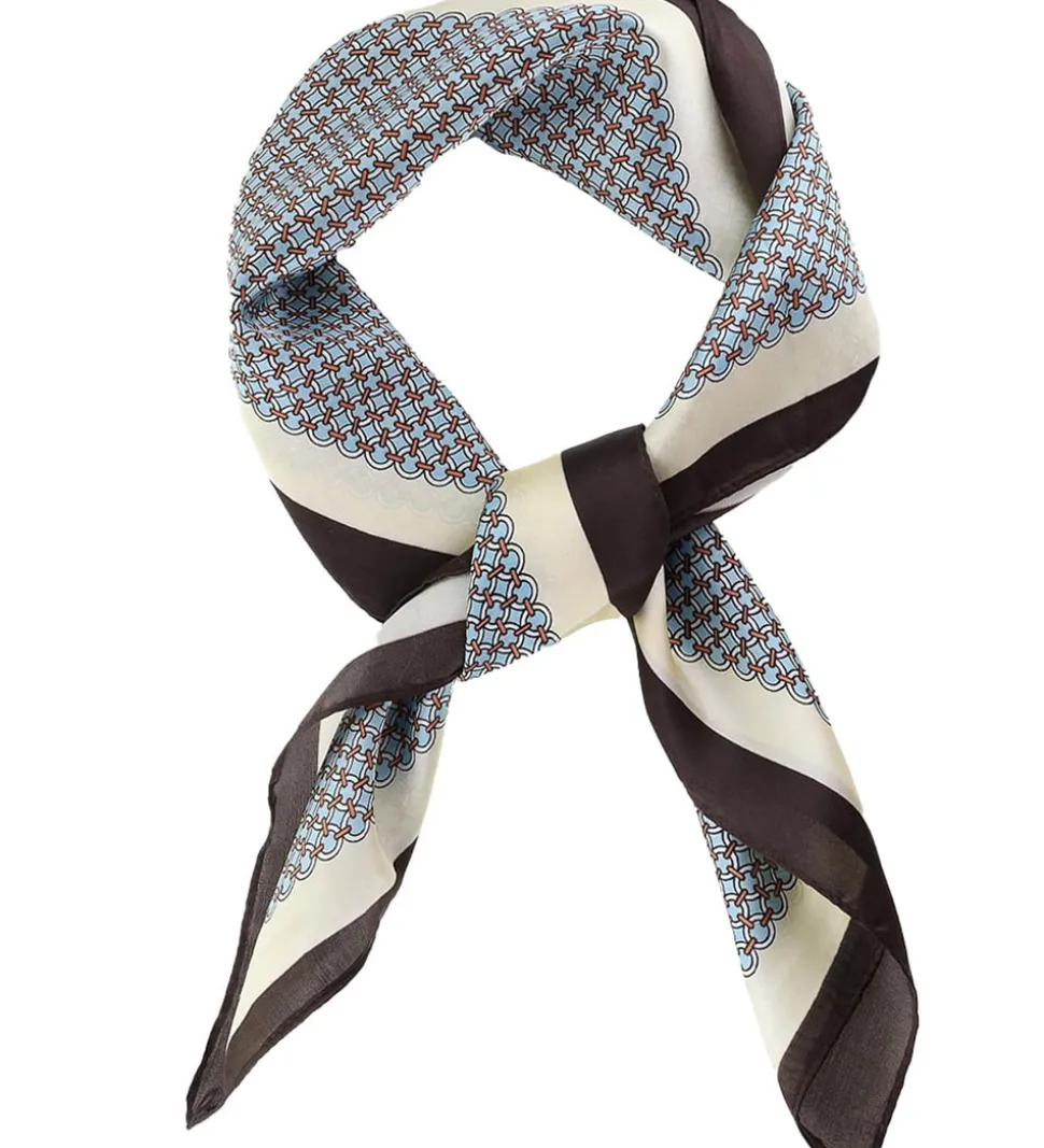 Flot By Stær tørklæde i blå med mønster i beige og brun og med en beige og mørkebrun kant. Tørklædet er lavet i en glat polyesterkvalitet, som tilføjer et stilfuldt touch til outfittet. Det kan f.eks. bruges omkring halsen, på tasken eller i bælstestropperne på bukserne.