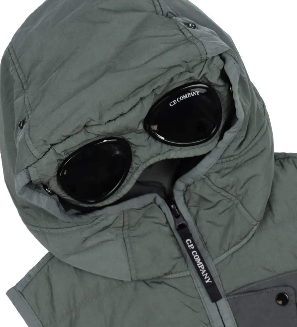 C.P. Company dynevesten har en fast hætte med et par solbriller, som holdes på plads med sorte trykknapper. Solbrillerne har et filter i kategori 1 med let tonede glas, som anbefales til overskyet vejr eller som beskyttelse mod vind og støv.