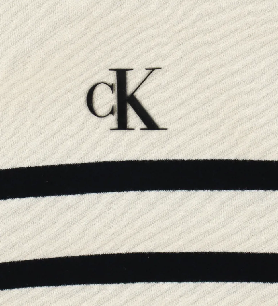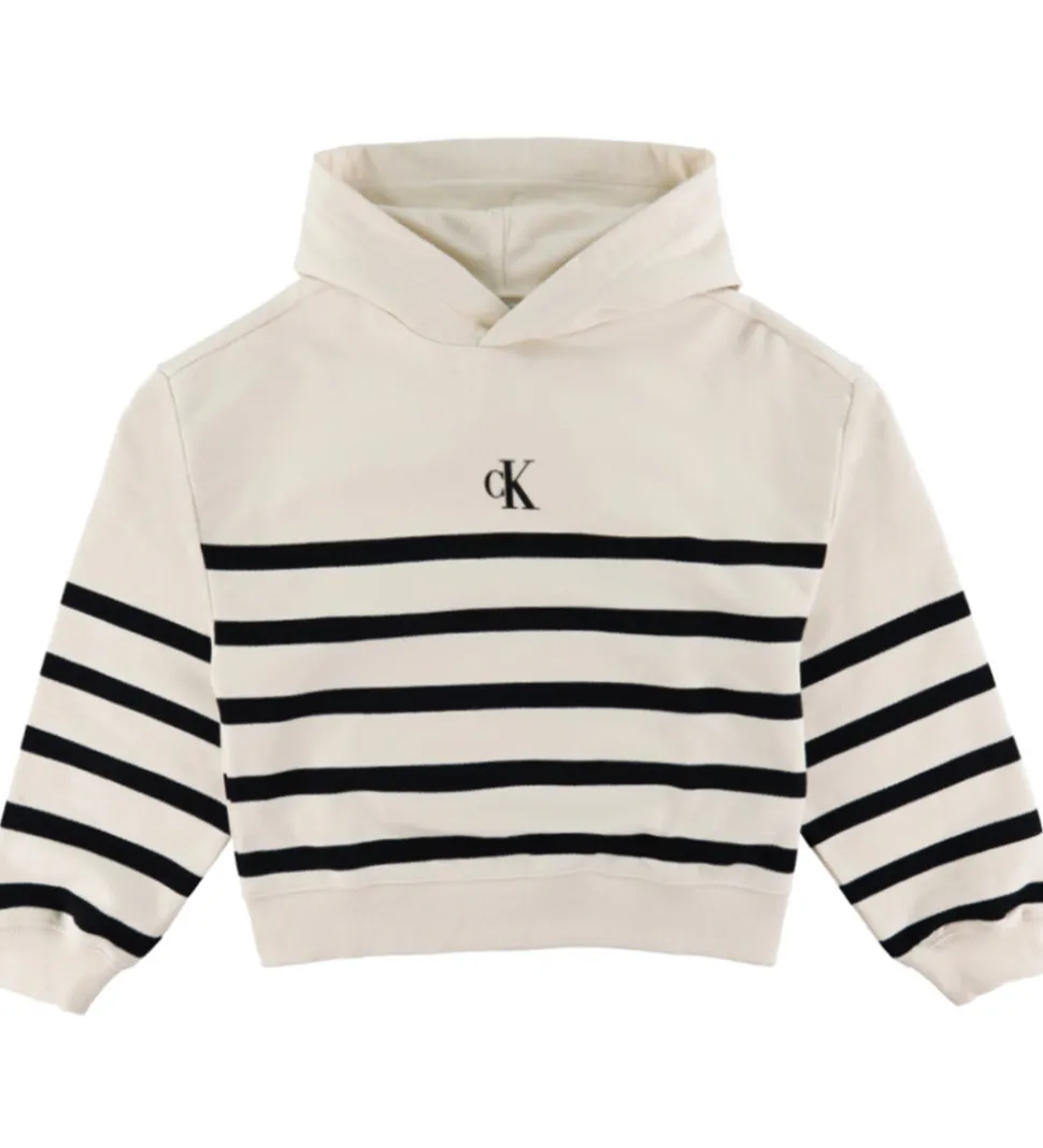 Stilren Calvin Klein hættetrøje i cremehvid med sorte, vandrette striber, der skaber et klassisk udtryk. Hættetrøjen er designet med et enkelt CK-logo på brystet og en let cropped fit, der giver en moderne silhouette.