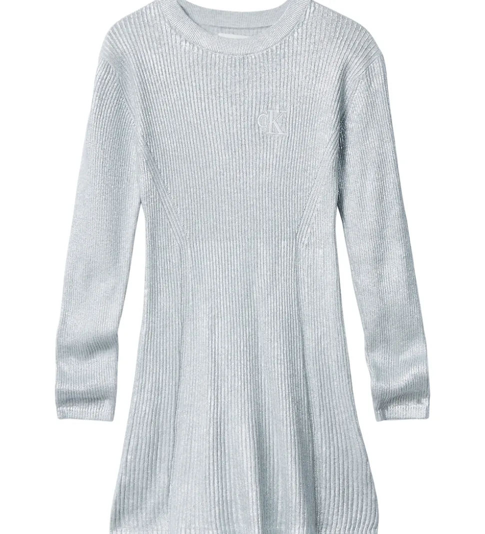 Elegant Calvin Klein kjole i en skinnende sølvfarve. Kjolen har lange ærmer og et diskret Calvin Klein logo på brystet. Den ribstrikkede struktur giver kjolen et minimalistisk udtryk, og en meget strækbar kvalitet.