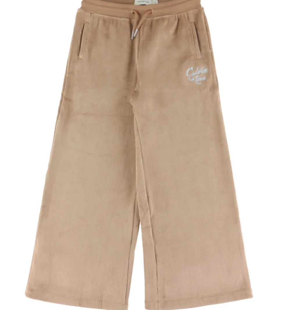 Elegant Calvin Klein sæt i beige fløjl med et broderet logo. Sættet består af en hættetrøje og et par fløjlsbukser. Hættetrøjen har ribkant ved ærmerne og forneden, og et hættefor i blød bomuld. Calvin Klein fløjlsbukserne har en elastikkant med justerbare bindesørre.