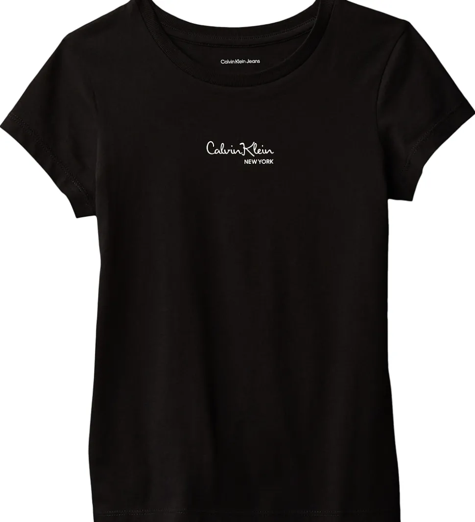 Elegant Calvin Klein t-shirt i en klassisk sort farve. T-shirten har et simpelt print på brystet med Calvin Klein New York i hvid skrift, som giver et stilfuldt udtryk. Den rundede halsudskæring med smal ribkant sikrer en god pasform.