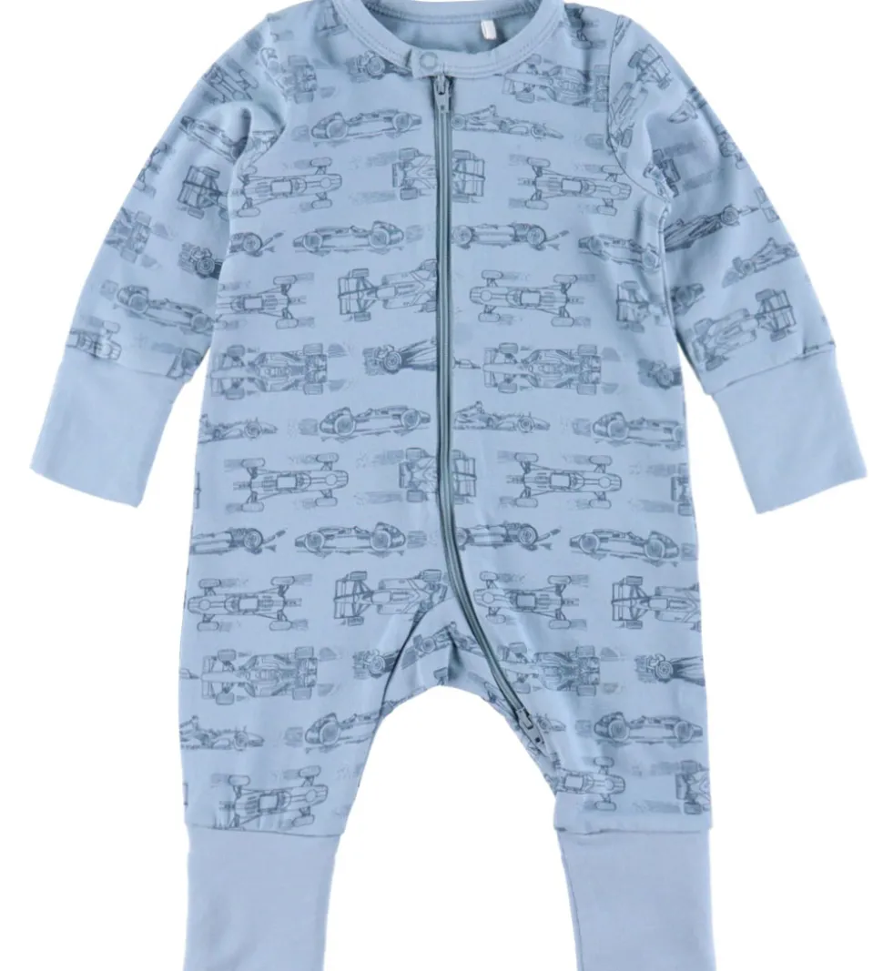 Flot CeLaVi natdragt i luseblå med print af racerbiler i mørkeblå. Natdragten har en rund halsudskæring med en trykknap fortil. Den har lange ærmer og ben, og lukkes fortil med en lynlås med to skydere. Natdragten har mulighed for ombuk til lukkede hænder og fødder.
