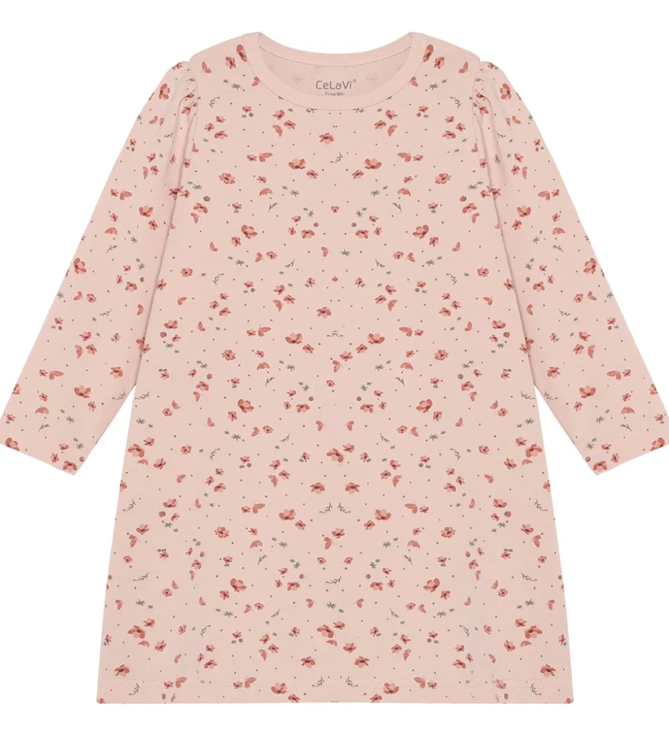 Fin CeLaVi natkjole i rosa med blomsterprint i rosa og grønne nuancer. Natkjolen har en rund halsudskæring og lange ærmer med rynker ved skuldrene.