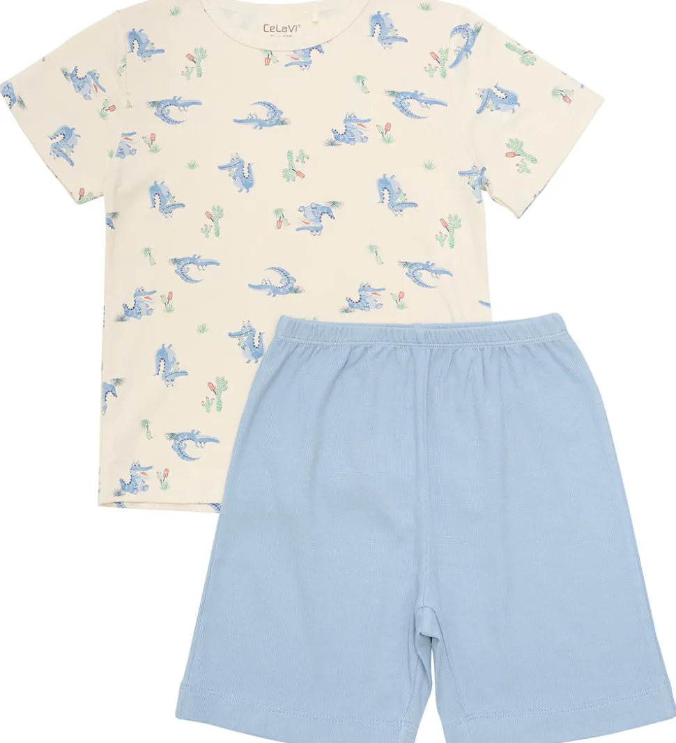 Farverigt CeLaVi nattøj 2-delt med t-shirt i beige med søde dinosaurer og shorts i lys blå. Nattøjet har korte ærmer og sikrer komfort hele natten med sit sjove design.