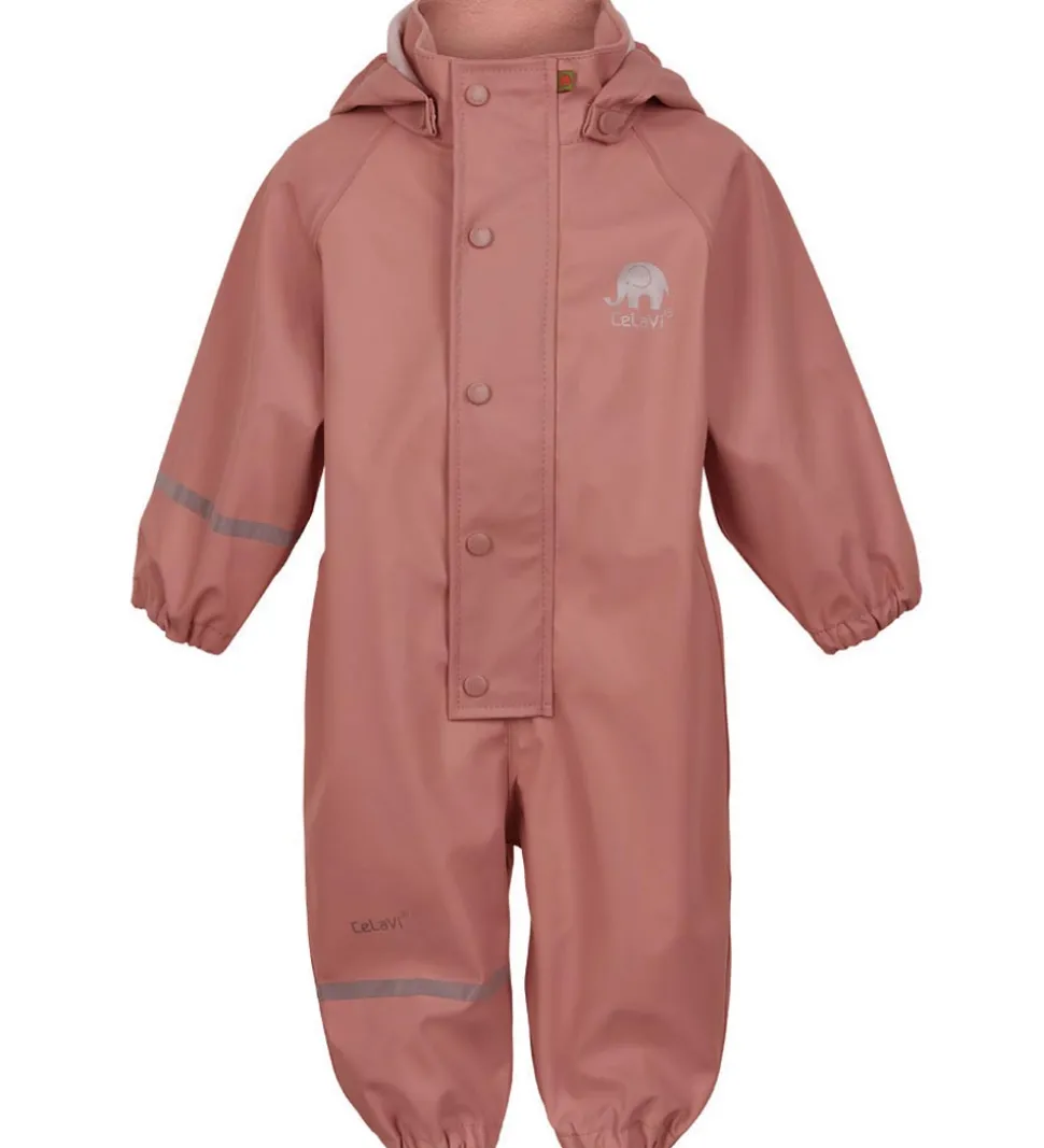 CeLaVi regndragten har en aftagelig hætte, som sidder fast med trykknapper. I toppen af hætten er der en elastikkant, og i halsåbningen er der blødt fleece. Ærmerne og buksebenene har smalle elastikkanter, og der er praktiske, justerbare elastikstropper til at at sætte under støvlerne.