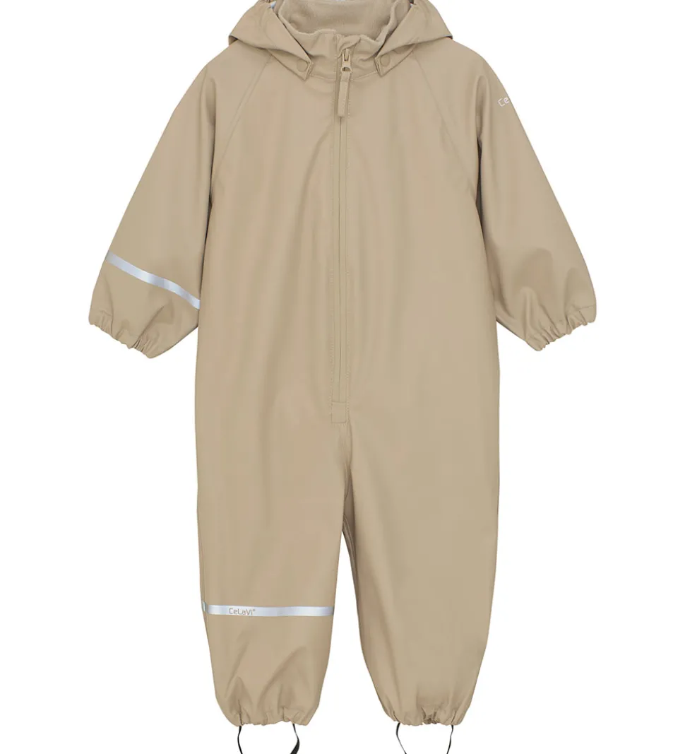 CeLaVi regndragten har en aftagelig hætte, som sidder fast med trykknapper. Ærmerne og buksebenene har elastikkanter, og der er justerbare elastikstropper til at sætte under fodtøjet. Kraven er foret med blødt fleece.