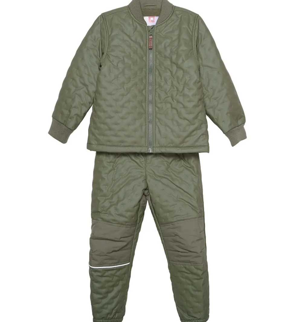 Lækkert CeLaVi termotøj i armygrøn med et indpræget prikmønster af stjerner, der giver det en quiltet struktur. Sættet består af en termojakke og et par termobukser med en praktisk PU-coating og fleeceforing.