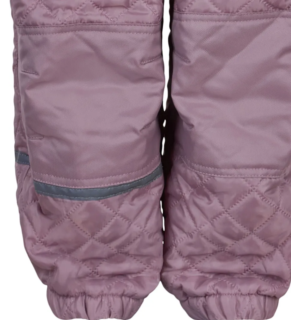 Lækkert CeLaVi termotøj bestående af en termojakke og et par termobukser i støvet lilla med en quiltet struktur. På termojakkens venstre bryst er navnet “CeLaVi” broderet på.