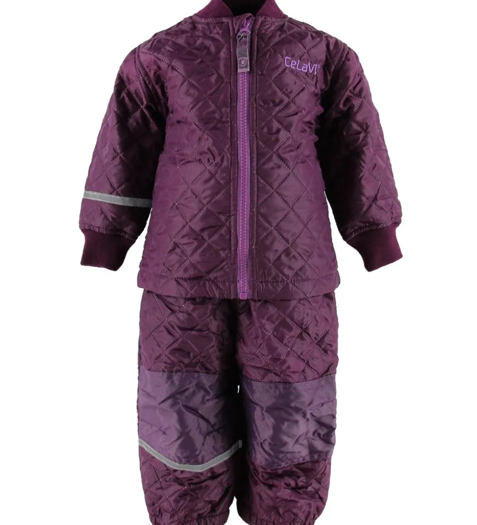 Skønt CeLaVi termotøj bestående af en jakke og et par bukser i mørkelilla med quiltet struktur. Omkring højre arm samt venstre ben er der en praktisk refleks.
