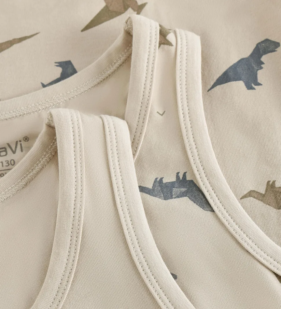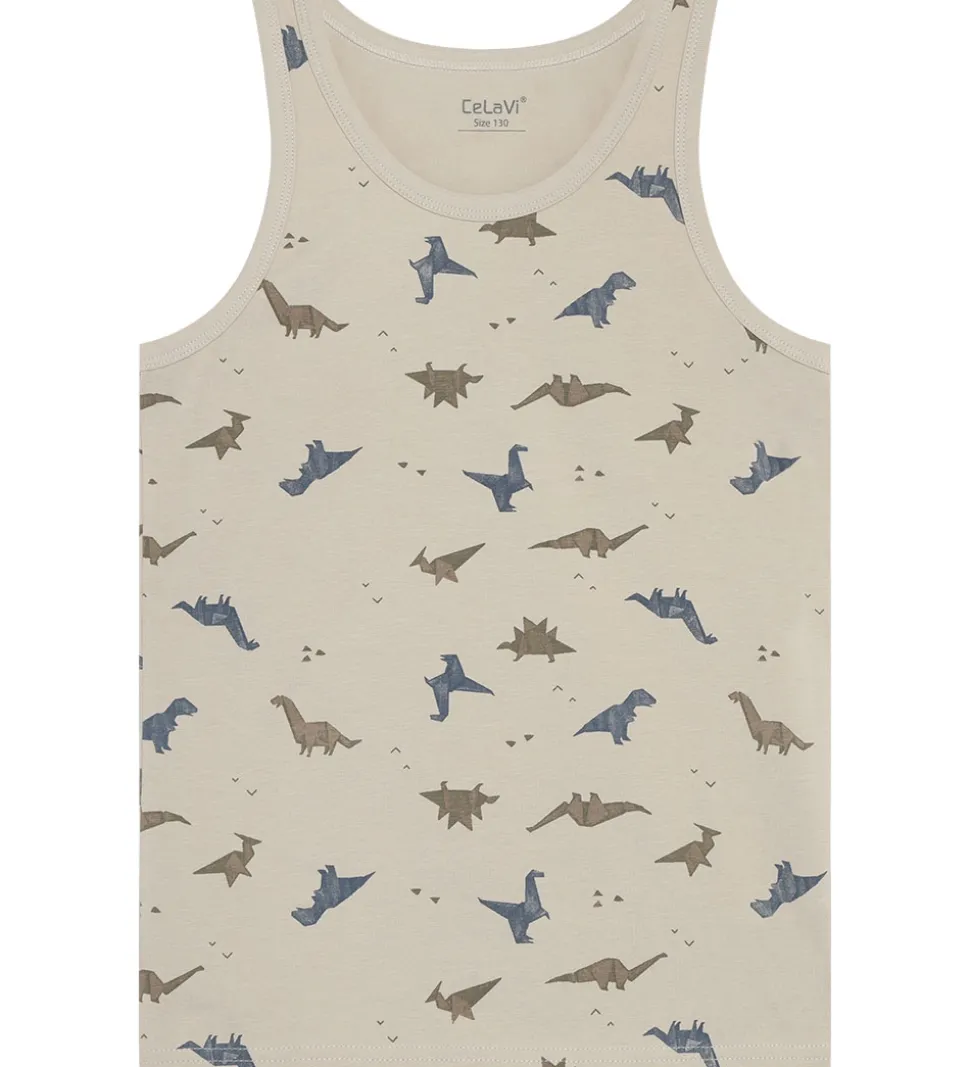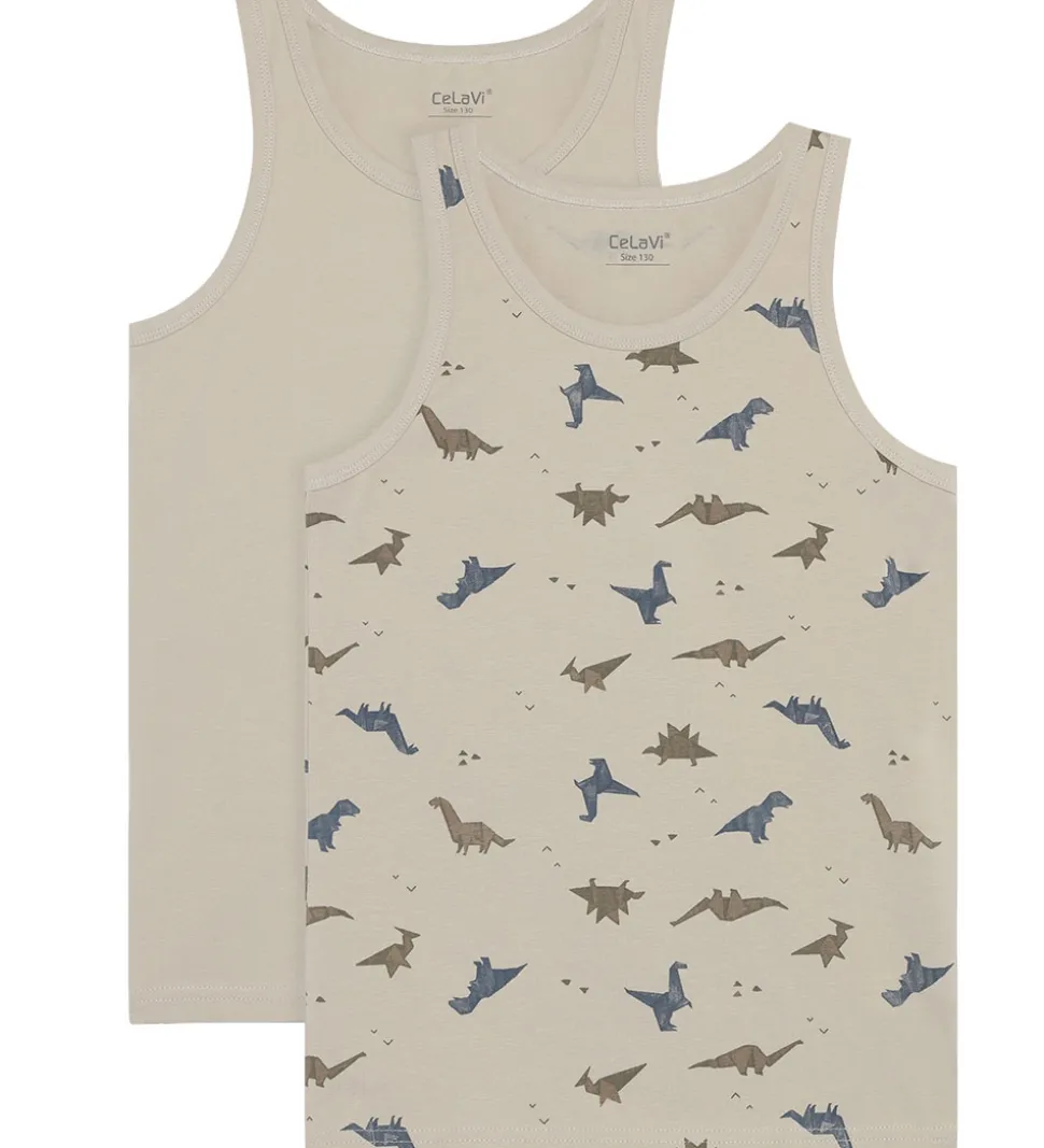 Flotte CeLaVi undertrøjer solgt i en 2-pak. Den ene undertrøje er ensfarvet beige, mens den anden er beige med et alloverprint af dinosaurer i armygrøn og mørkeblå. Undertrøjerne har brede skulderstropper og er fremstillet i en blød kvalitet.
