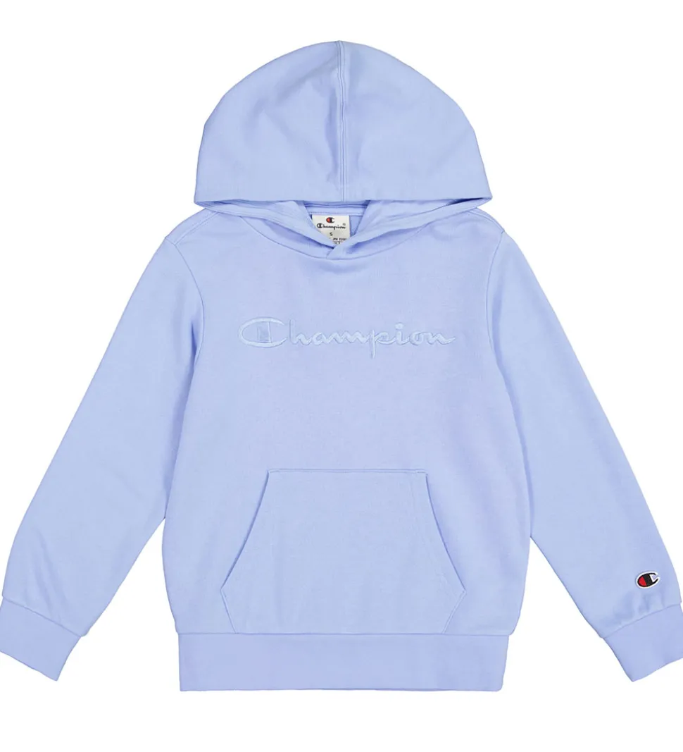 Lækker Champion hættetrøje i en lyseblå farve med et diskret logoprint broderet på fronten. Hættetrøjen har lange ærmer og en praktisk kængurulomme, ideel til at holde hænderne varme.