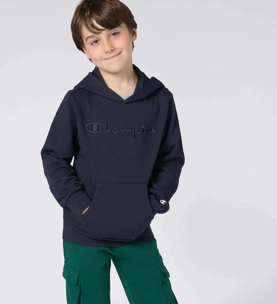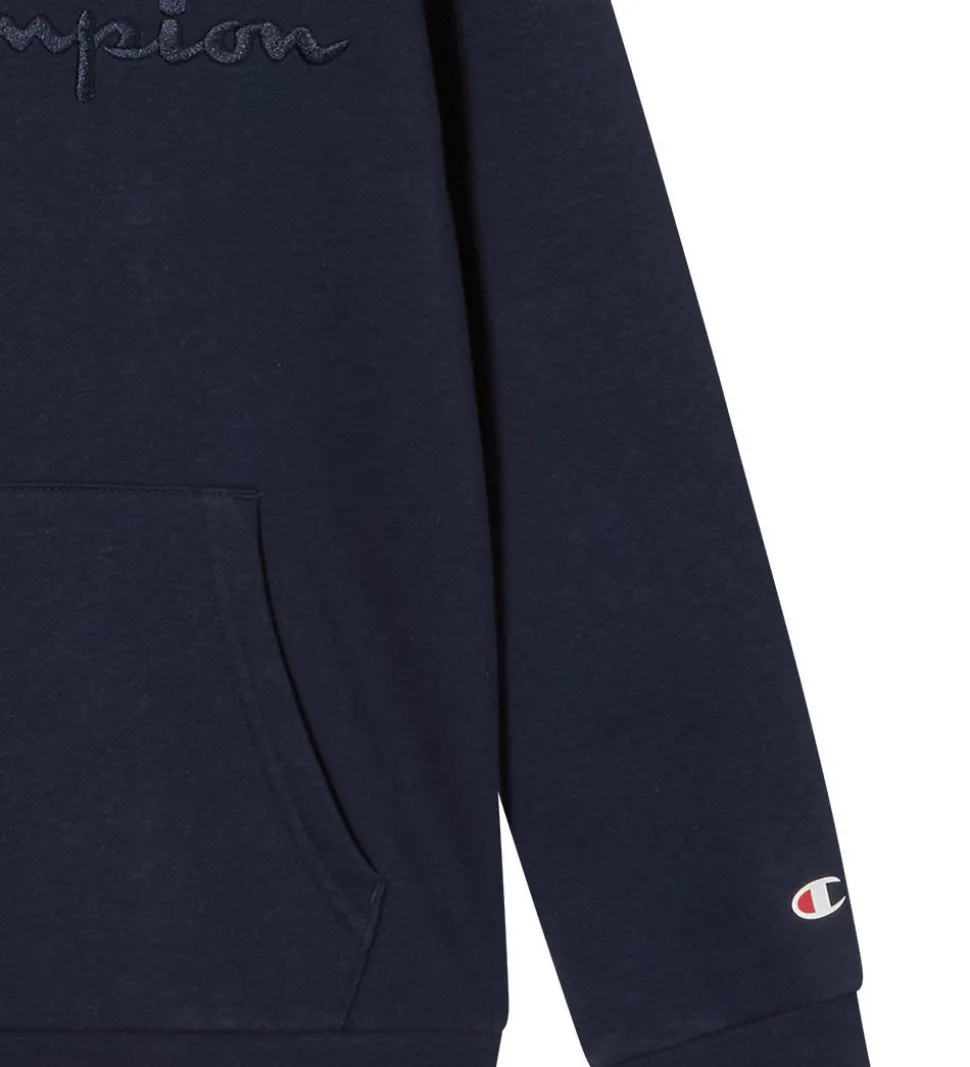 Stilfuld Champion hættetrøje i en dyb marineblå farve med et elegant, tone-i-tone broderet logo på fronten. Champion hættetrøjen har en praktisk kængurulomme og brede ribkanter ved håndleddene og forneden. Hættetrøjen har en rummelig hætte, der giver et afslappet look. Hættetrøjen har blødt, børste bomuld på indersiden.