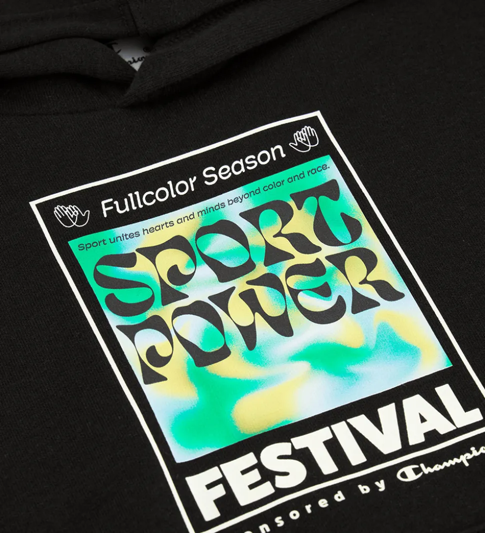 Stilfuld Champion hættetrøje i sort med farverigt print på fronten. Hættetrøjen har lange ærmer og en praktisk kængurulomme på maven, hvilket gør den til et komfortabelt valg til hverdag.