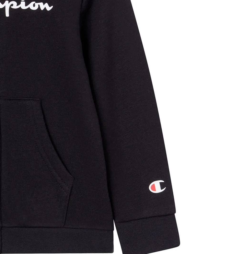 Champion cardiganen har en blød hætte, lange ærmer og åbnes fortil med en gennemgående lynlås. Fortil er der en opdelt kængurulomme. Sweatpantsene har en god elastik i taljen, som kan justeres med snører fortil. I benåbningerne er der brede ribkanter. Sweatsættet har blødt, børstet bomuld på indersiden.
