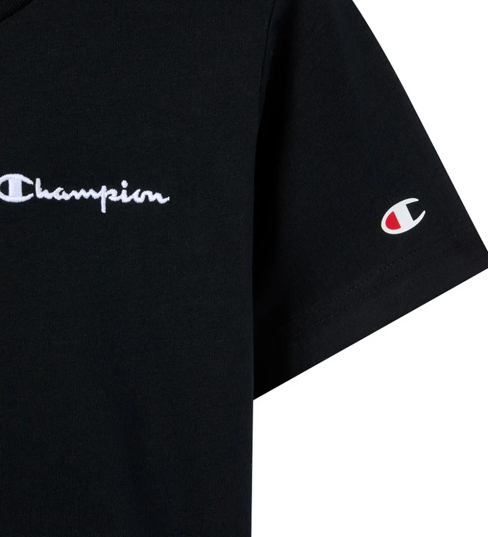 Stilfuld Champion t-shirt i sort. T-shirten har et broderet logo i hvid på venstre bryst. Champion t-shirten har en rund halsudskæring med en smal ribkant og korte ærmer.