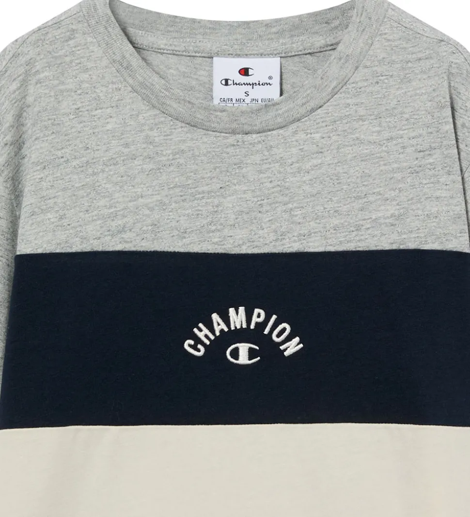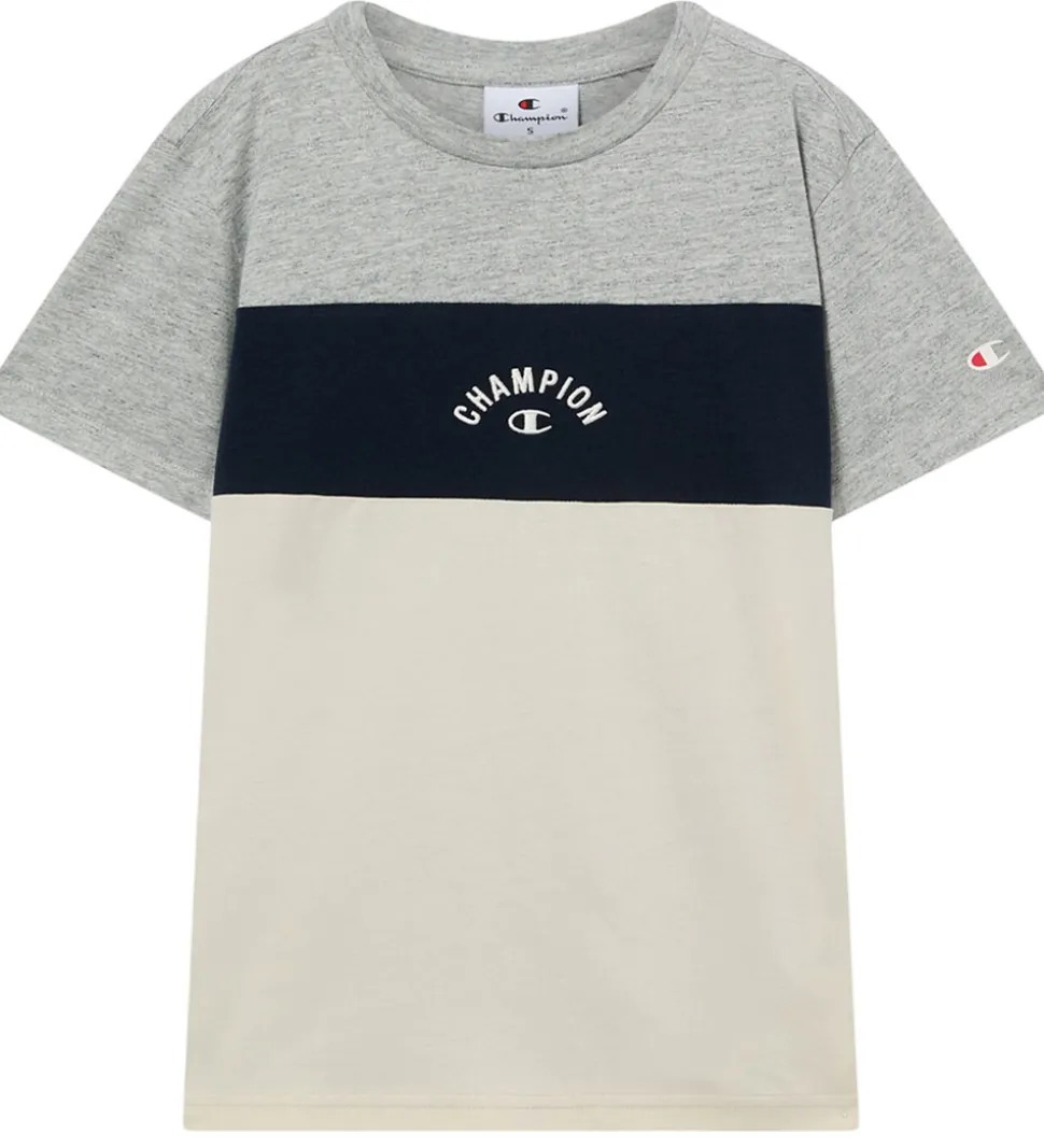 Flot Champion t-shirt i en kombination af gråmeleret, navyblå og beige. På brystet er der et broderet logo i hvid. Champion t-shirten har en rund halsudskæring med en smal ribkant og korte ærmer.