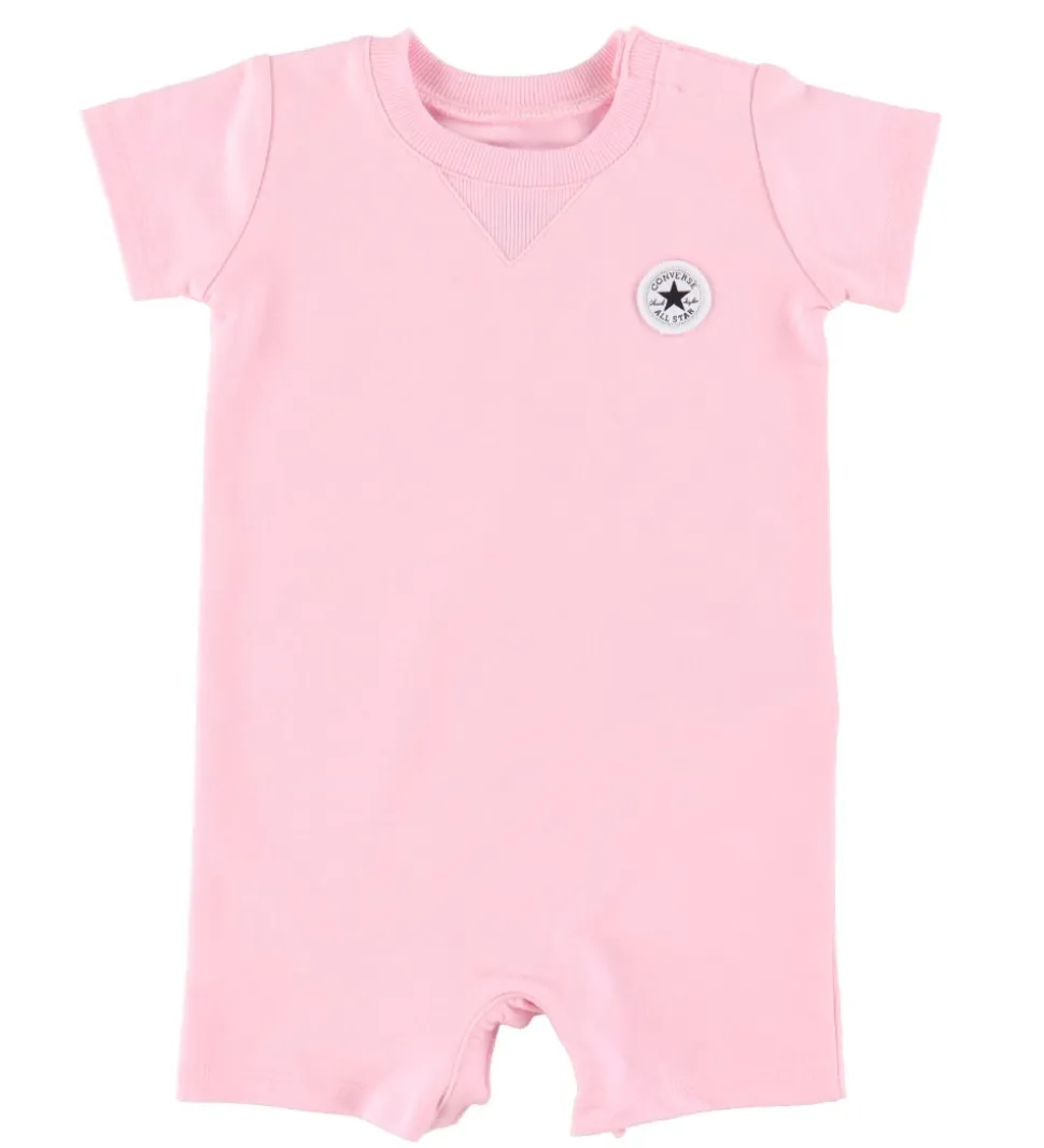 Sødt Converse sæt bestående af en sommerdragt og et par strømper i lyserød med logo. Strømperne er printet som en Converse-sko med en hvid bund og hvide snørebånd.