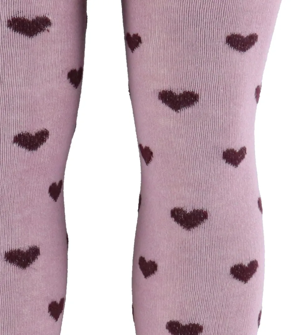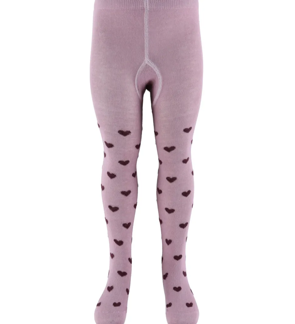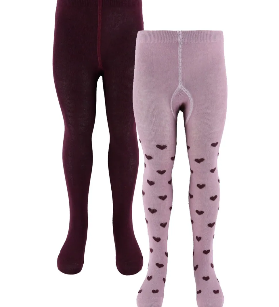 Fine Creamie strømpebukser i en 2-pak bestående af et ensfarvet mørkelilla par og et lyserødt par med små, mørkelilla hjerter. Creamie strømpebukserne har elastik i taljen, som sikrer en god pasform.