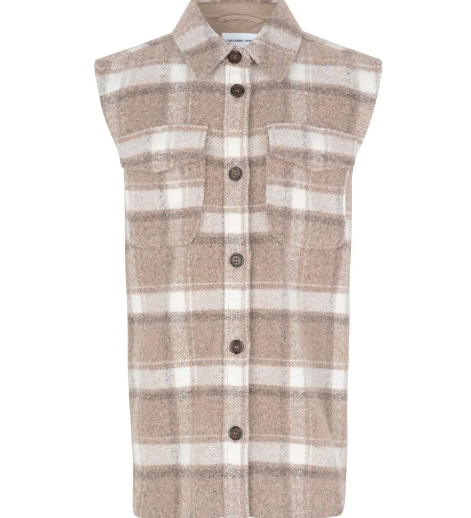 Fin Designers Remix vest med et ternet mønster i beige, hvid og brun.