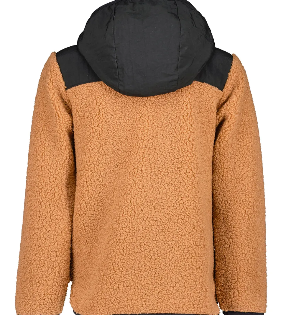 Lækker Didriksons fleecejakke i brun teddyfleece med sorte, glatvævede detaljer. På venstre bryst er der en sort logopatch med en lomme der åbnes ved hjælp af en lynlås.