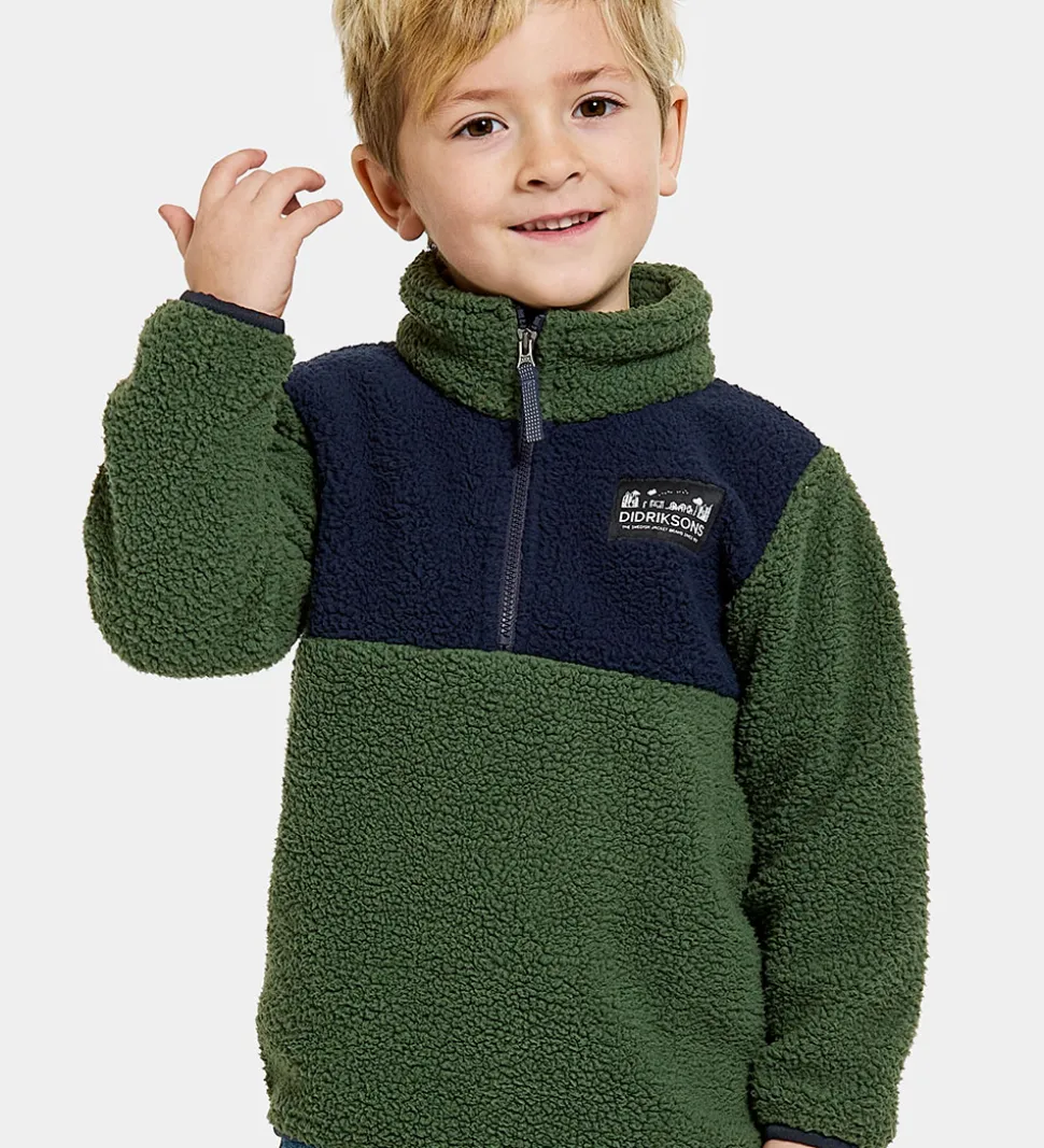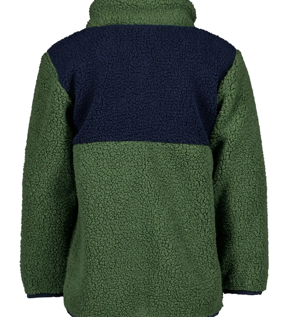 Smart Didriksons fleecetrøje i støvet grønt teddyfleece, og i toppener den navy.