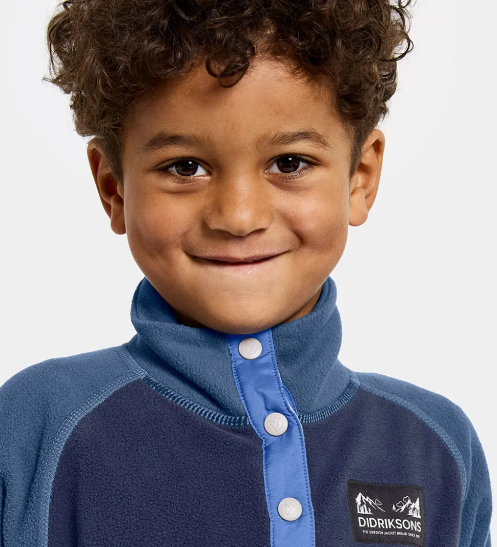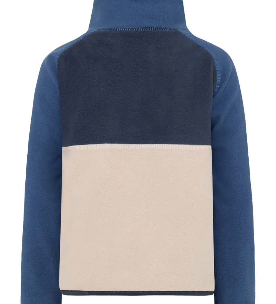 Attraktiv Didriksons fleecetrøje med en kombination af to blå nuancer og beige. Fleecetrøjen har smalle, elastiske kanter og en høj hals. Fleecetrøjen åbnes i toppen med trykknapper.