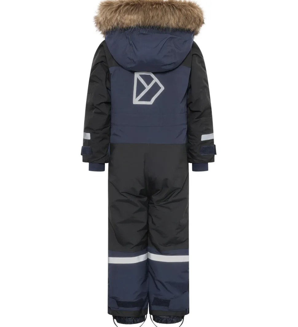 Flot Didriksons flyverdragt i navyblå og sort og med et broderet, hvidt logo på venstre bryst. Flyverdragten har velplacerede, praktiske reflekser.