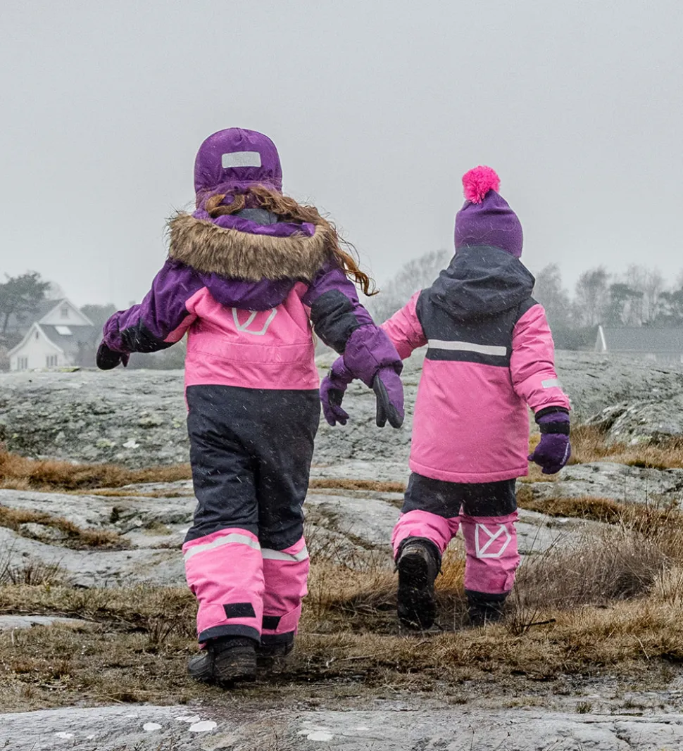 Flot Didriksons flyverdragt i pink, rosa og lilla og med et broderet, hvidt logo på venstre bryst. Flyverdragten har velplacerede, praktiske reflekser.