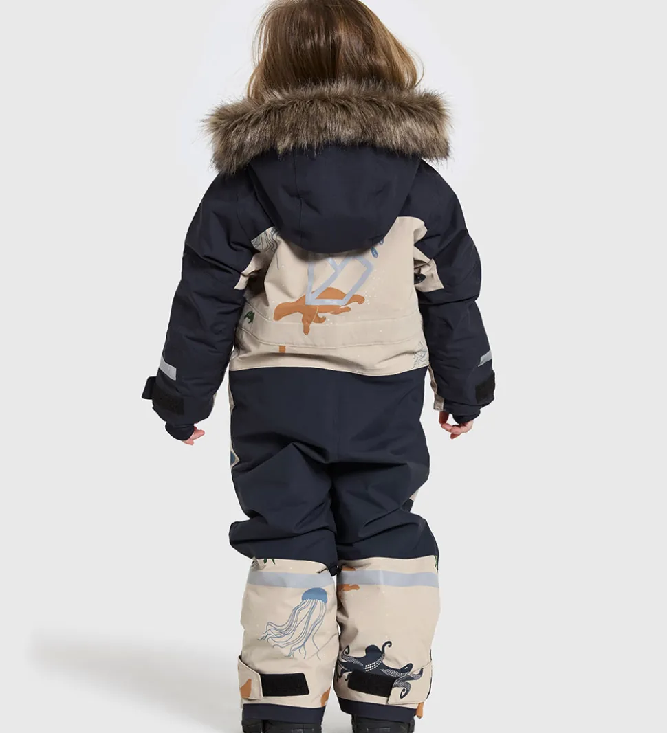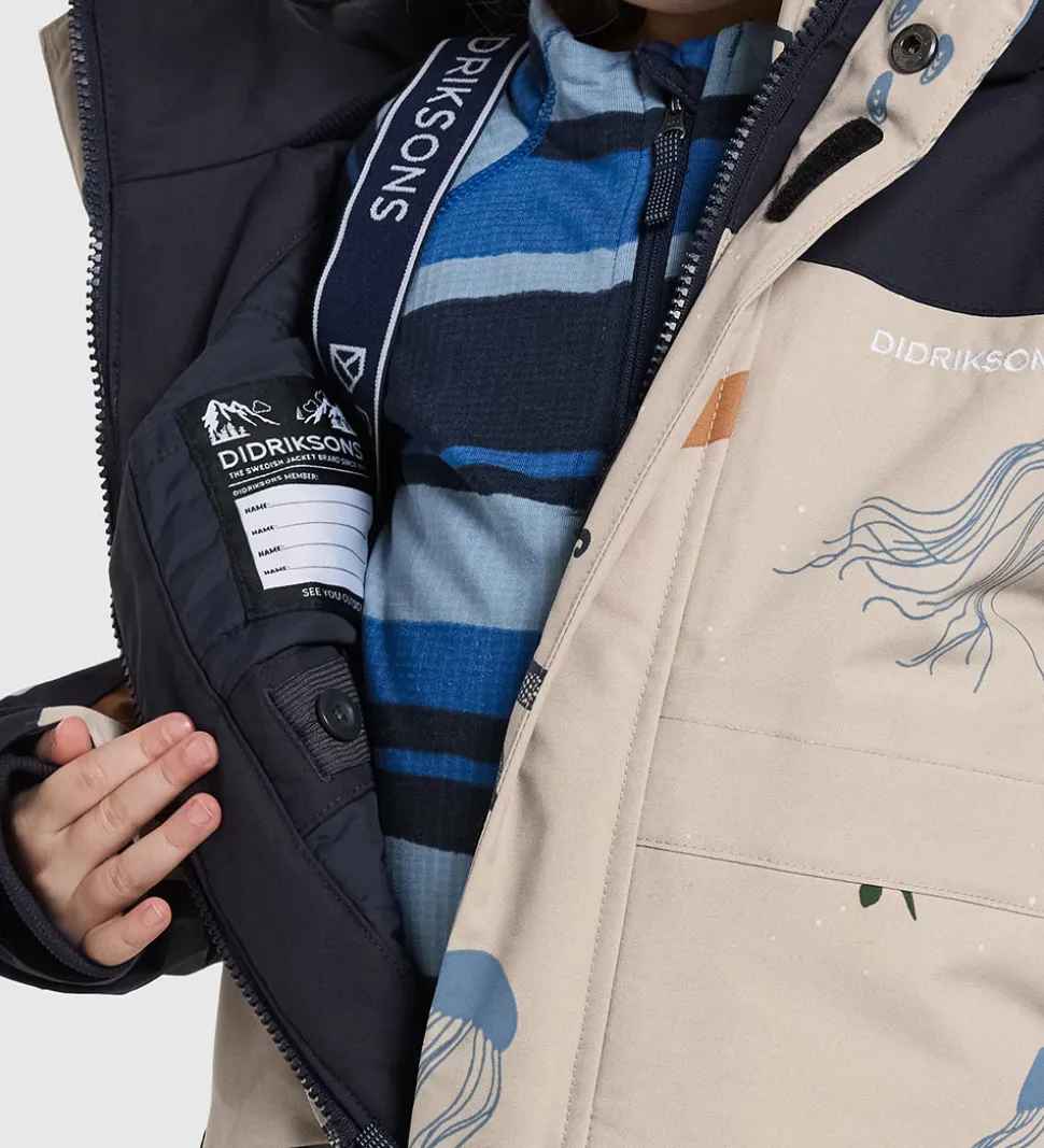 Flot Didriksons flyverdragt i navyblå og beige med et harverigt havdyrsprint. Flyverdragten har et broderet, hvidt logo på venstre bryst og velplacerede, praktiske reflekser.