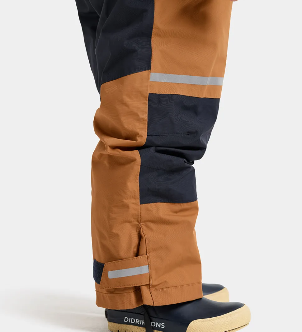 Buksebenene har praktiske snefang med gummibelagte elastikkanter og aftagelige, justerbare støvlestropper i gummi. Åbningerne kan strammes ind med et velcrobånd.