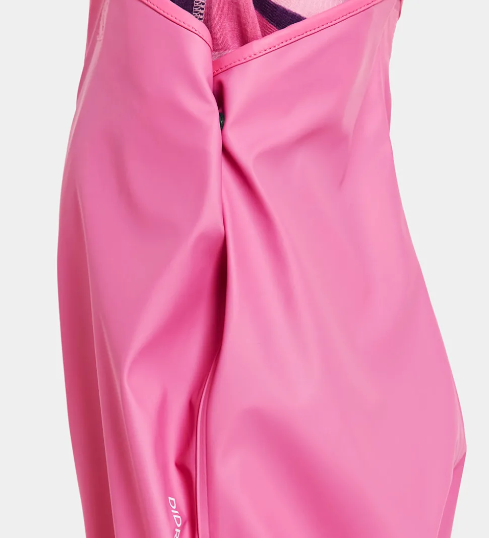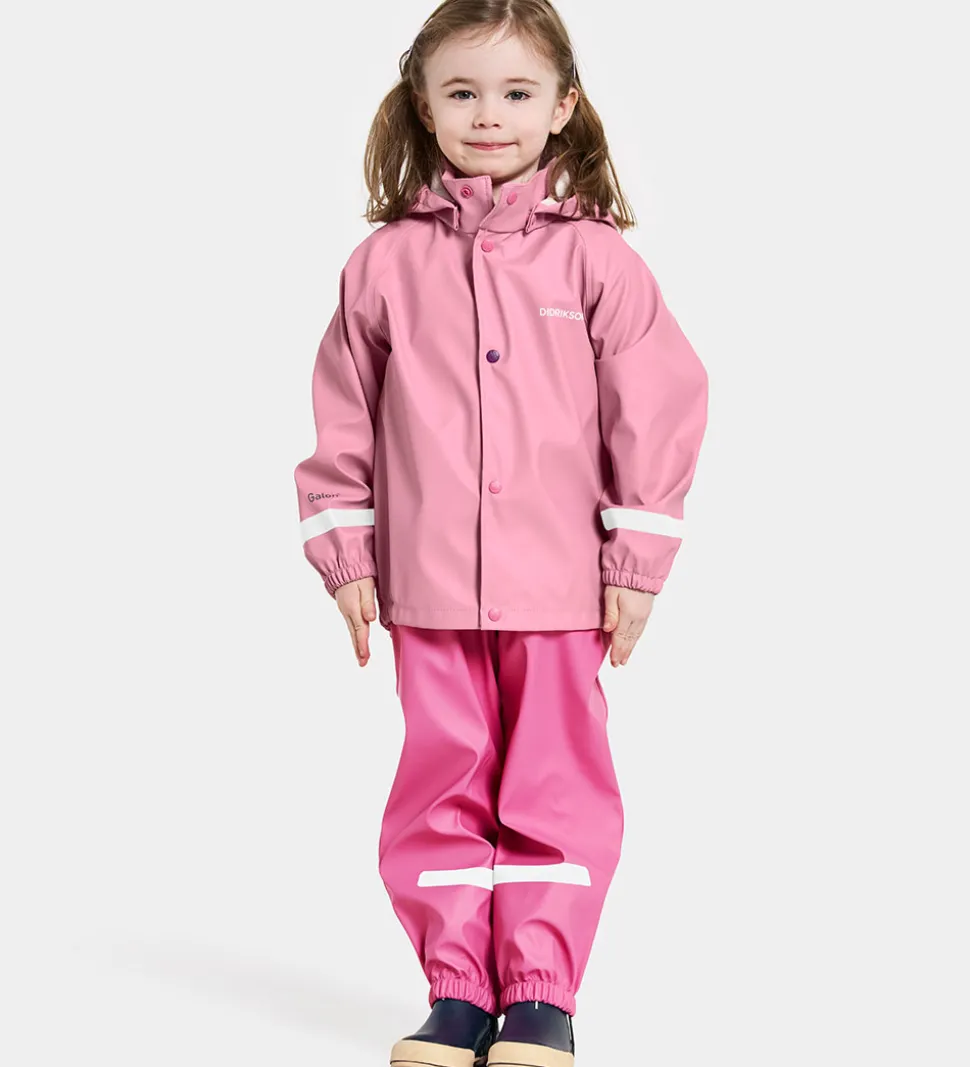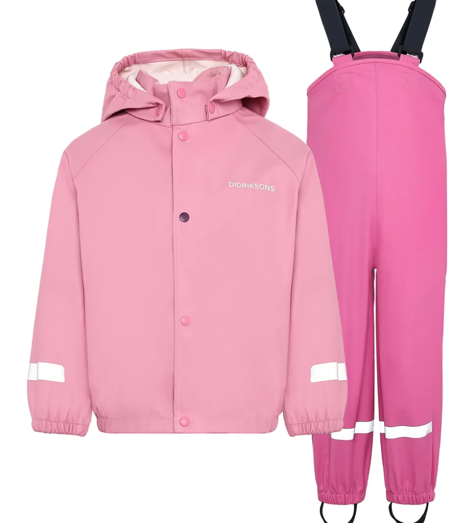 Flot Didriksons regntøj, der består af en regnjakke og et par regnbukser i to forskellige nuancer af rosa. Regntøjet er lavet af PU.