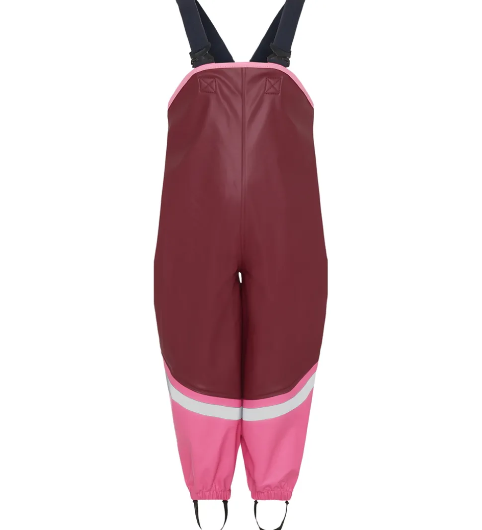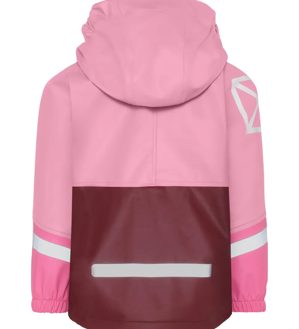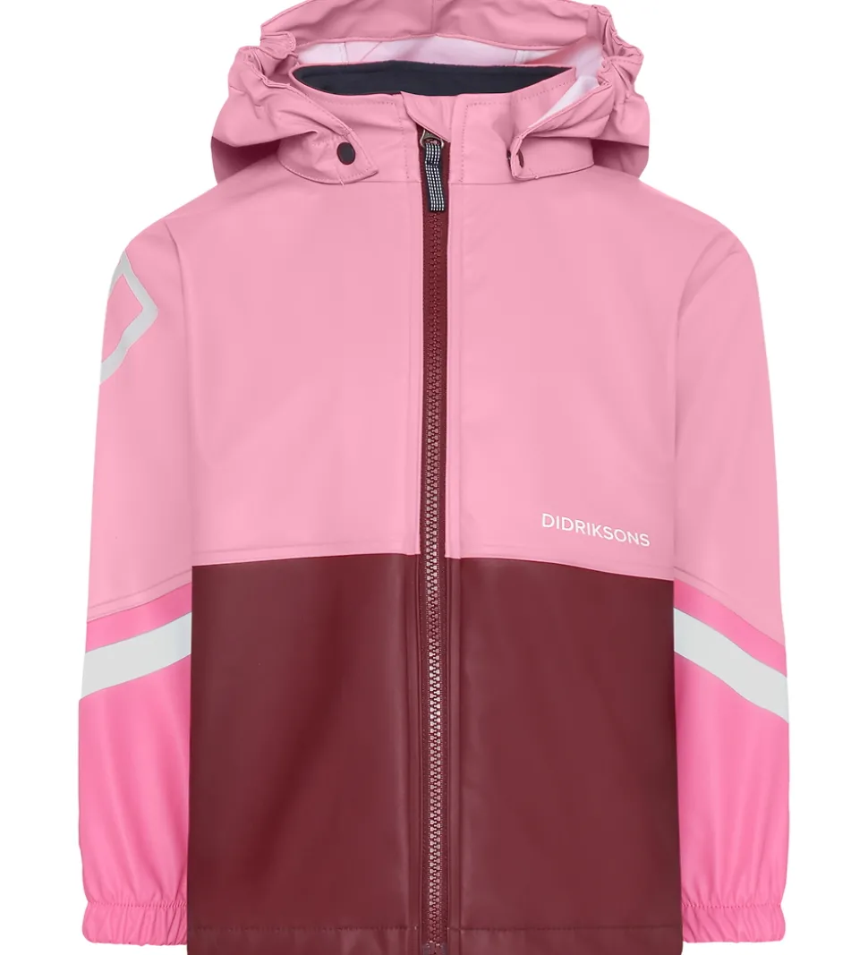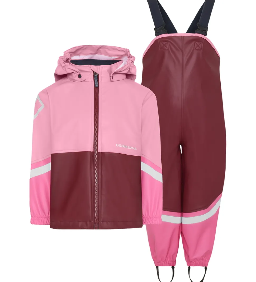Flot Didriksons regntøj, der består af en regnjakke og et par regnbukser med seler i rosa nuancer og lilla detaljer. Regntøjet er lavet af PU.