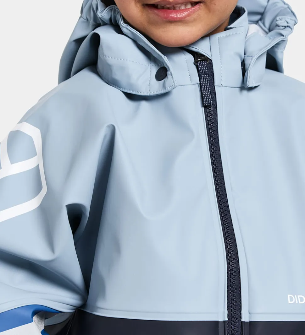 Didriksons regnjakken har en aftagelig hætte, som sidder fast med trykknapper, og ærmerne har brede elastikkanter. i bunden kan regnjakken strammes ind med en elastiksnøre. Regnjakken lukkes med en lynlås med hagebeskytter og indvendig vindstolpe, og i halsåbningen er den foret med blødt fleece.