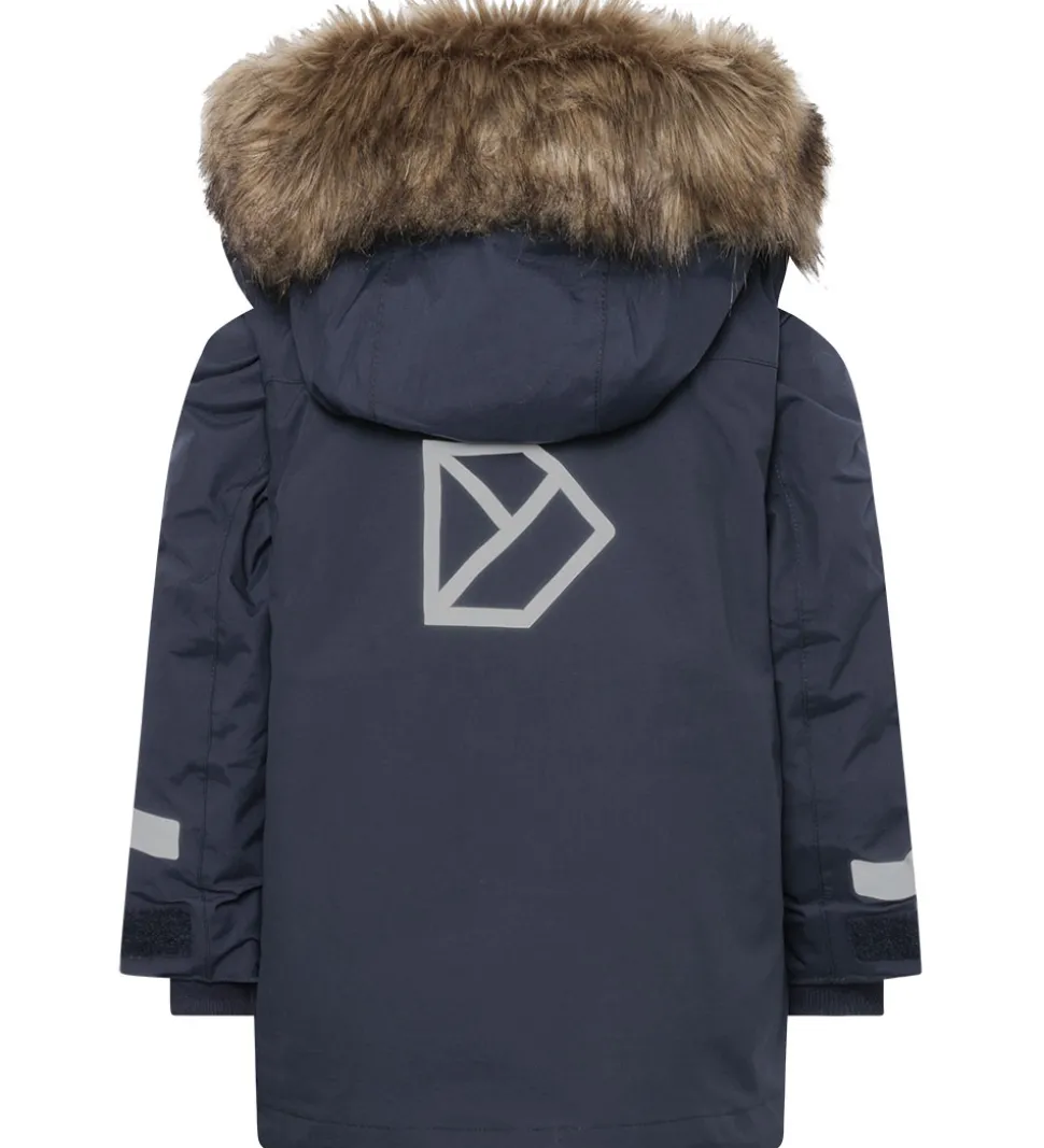 Sej Didriksons vinterjakke i navyblå. Hætten har en flot kant af imiteret pels. Vinterjakken har praktiske reflekser yderst på ærmerne og et stort refleksprint på ryggen.